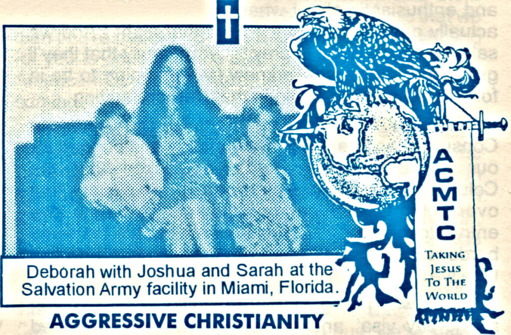 Now we were on the plane to Miami, Florida, because that was the only place in the United States that we had enough money to get to. Now Miami, Florida, was a huge-and still is-a huge city. We’d never been there in our lives. We didn’t know one person; we had no idea where to go. But that night, the night before we got on the plane, when we had been in the man’s house and in his room that he had given us to stay in, the Lord had spoken to me, and He said, “When you get to Miami…” Now he told me, “When you get to Miami…” and we didn’t even know where we were going. He said, “When you get to Miami, you go to the Salvation Army.” And I thought, “What does God want me to go to a thrift store for?” But I just shut my eyes, shut my mind off, and went to sleep. And then, the next day, we ended up, you know, flying into Miami. And of course it was one of these island jumping routes where they’d stop at island after island after island after island, all up through the Caribbean. And my son Joshua was really angry at the concept of a seatbelt and having to stay confined in his seat. And he kept getting up, and you know, taking off his belt, getting up, trying to walk around…getting up, standing up, and on and on, and finally the stewardess threatened to throw him off the plane, and that calmed him down because I told him, “Look out there at the window. See, there’s nothing out there. She throws you out of the plane, that’s where you’ll go.” So he calmed down, and finally we ended up getting into Miami.